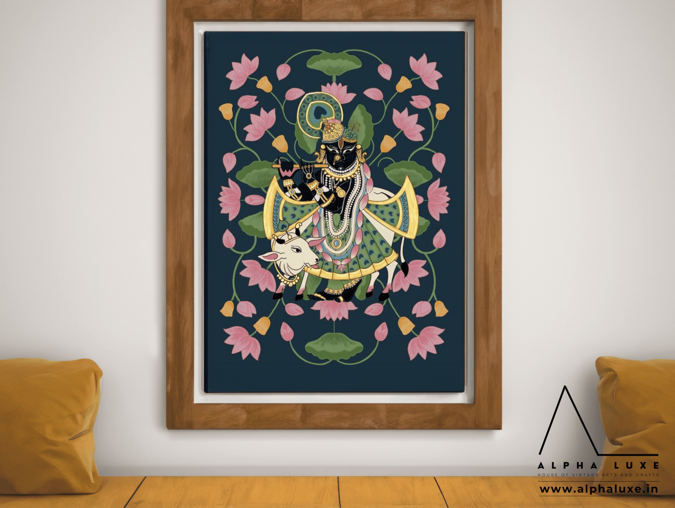 Immerse in the divine aura of the Shree Krishna Pichwai, a captivating art form depicting the Shyama Avatar of the Supreme Lord. Symbolizing grace and divinity, this alluring masterpiece brings the essence of devotion and vibrancy to those who see it.