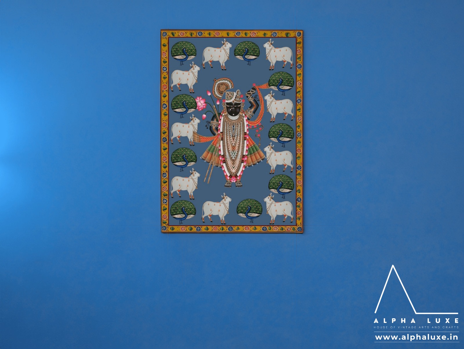 jqk41.comA beauteous depiction of Shree Krishna surrounded by his most loved animals, the peacock and the cow. The peacock is the symbolism of the nature around Shree Krishna & the beauty of Vrindavan and since Shree Krishna was a Gopala, while he used to graze cows, he used to take out his venu and played it, resulting in the cows gathering around him.