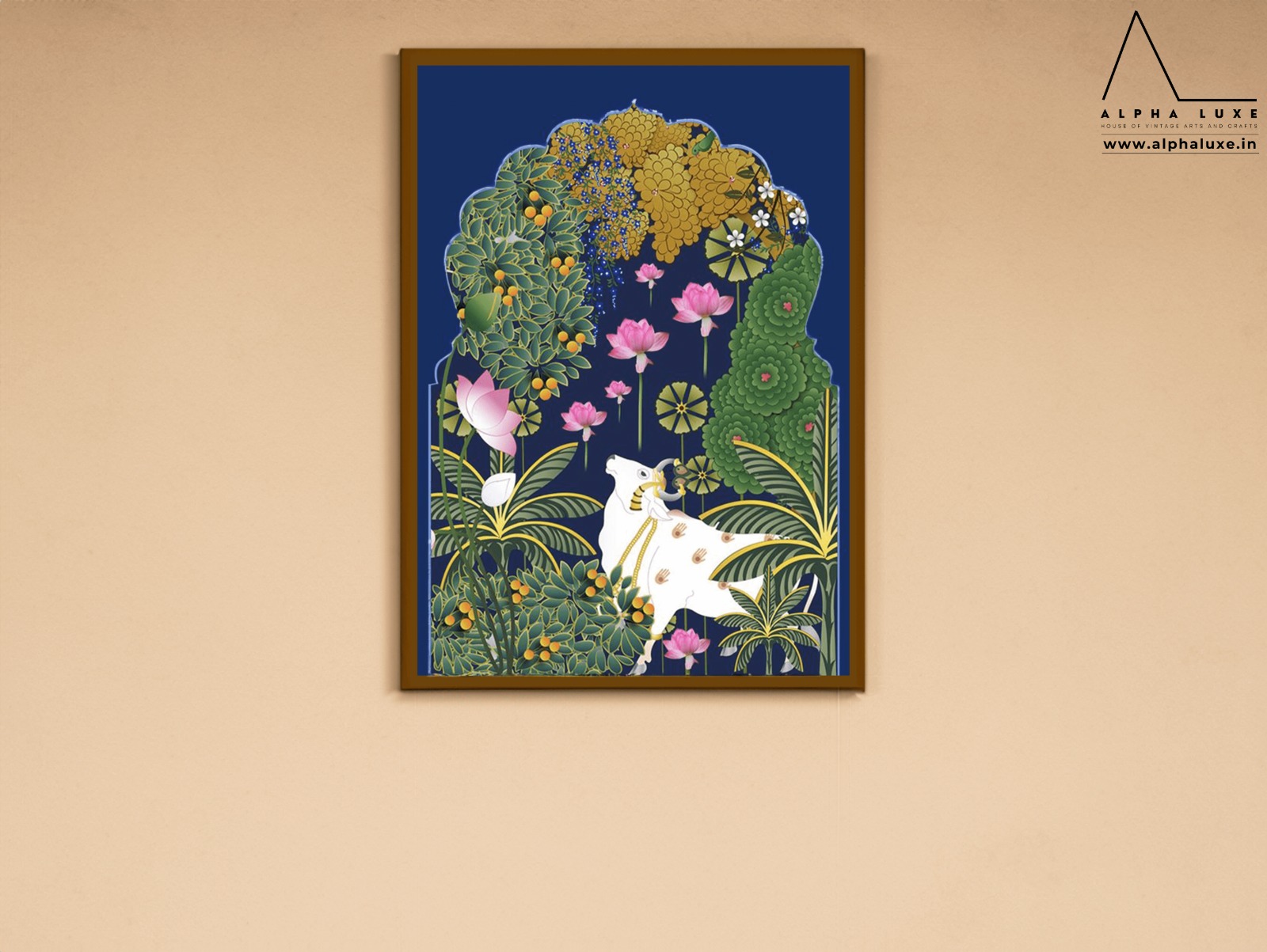 A pleasing to the eye artwork showcasing a cow roaming in a forest mesmerised by the beauty of how the forest looks full of life after a rainfall.