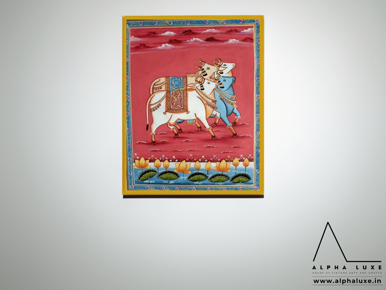 A beautiful artwork showcaing Mangala, Pingala, Hamsi & Vamshipriya; who are some of the favourite cows of Shree Krishna.