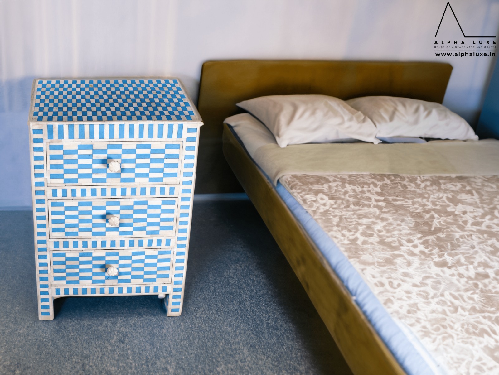 Each of our gorgeous bedside tables have been carefully hand crafted and inlaid with cruelty free bone, and each piece is available in a variety of sizes and styles to suit your life and your taste. These gorgeous bone inlay bedside tables are fully applying resin, the finish is smoothed out by sanding back the resin. In contrast to much of the mass produced factory built furniture that is churned out on the production line, there is something incredibly motivating about having Indian furniture in your home that has required the time and attention of a dedicated and experienced craftsman.