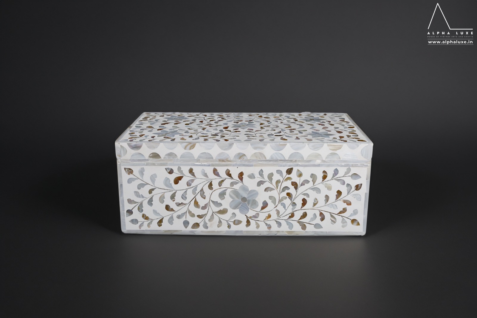 The intricate flower design and craftsmanship on our elegant mother-of-pearl inlay decorative box are unique to the Indian state of Rajasthan. This lovely inlay decorative box will bring color to any shelf or table. Each of our beautiful boxes is a one-of-a-kind work of art since mother of pearl shells vary in color, weight, and veining.