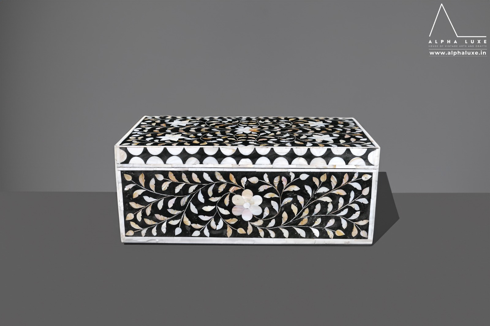 The intricate flower design and craftsmanship on our elegant mother-of-pearl inlay decorative box are unique to the Indian state of Rajasthan. This lovely inlay decorative box will bring color to any shelf or table. Each of our beautiful boxes is a one-of-a-kind work of art since mother of pearl shells vary in color, weight, and veining.