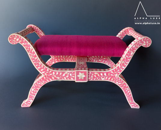 The intricate mother of pearl inlay patterns have been handcrafted by our skilled artisans and each dip and dive in the swirling floral pattern has been carved with absolute care. The mother of pearl has been affixed onto a blue resin where the patterns are carved. The entire Roman chair is constructed around a sturdy mango wood frame that is sure to last for years and years to come.
