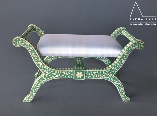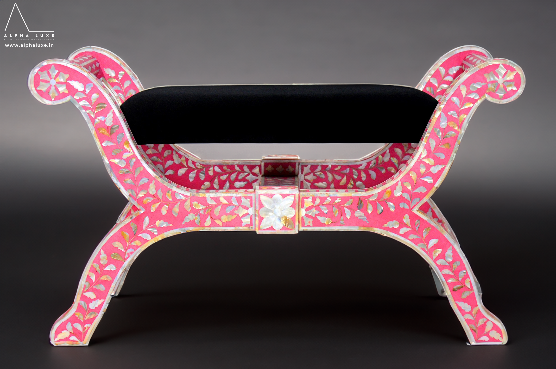 The intricate mother of pearl inlay patterns have been handcrafted by our skilled artisans and each dip and dive in the swirling floral pattern has been carved with absolute care. The mother of pearl has been affixed onto a blue resin where the patterns are carved. The entire Roman chair is constructed around a sturdy mango wood frame that is sure to last for years and years to come.