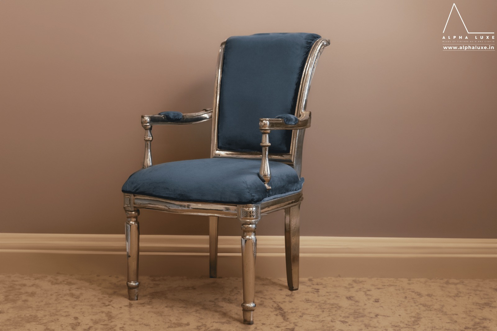 Enhance the glory of your living room by acquiring this beautifully crafted Silver Chair with the timeless combination of Blue & Sapphire, inspired from the Bouron dynasty of France.